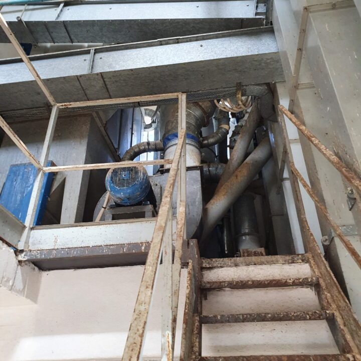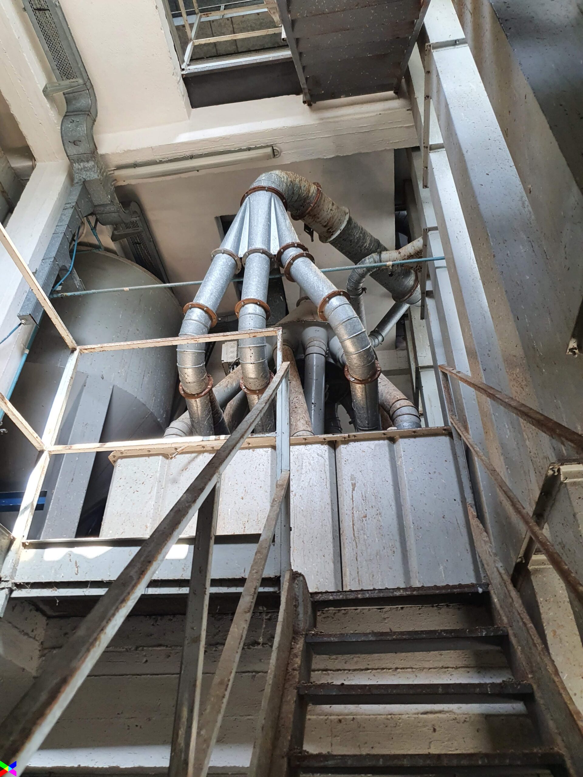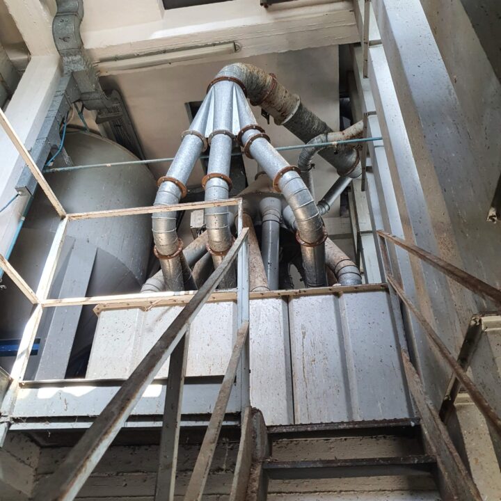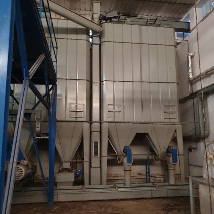 Tutte le macchine presenti nella struttura in calcestruzzo a sviluppo verticale sono interconnesse da un impianto di aspirazione delle polveri prodotte nelle fasi di lavorazione.