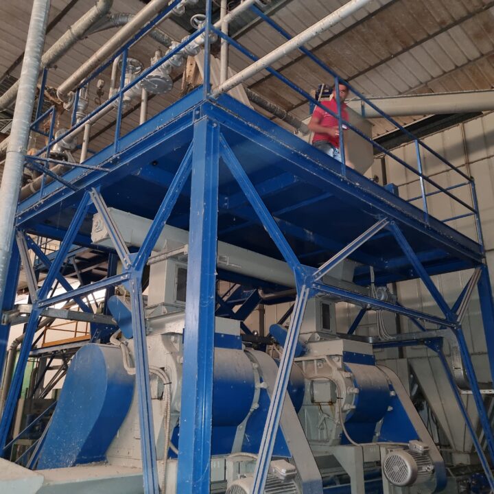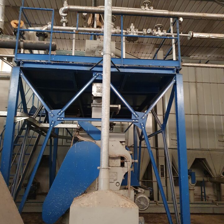 In tale struttura avviene dapprima il dosaggio degli elementi del mangime finito all’interno di 3 contenitori muniti di pesa comandata e controllati da uno specifico computer centrale che stabilisce le quantità dei diversi componenti, in ragione della percentuale di ciascuno, nella miscela finita.