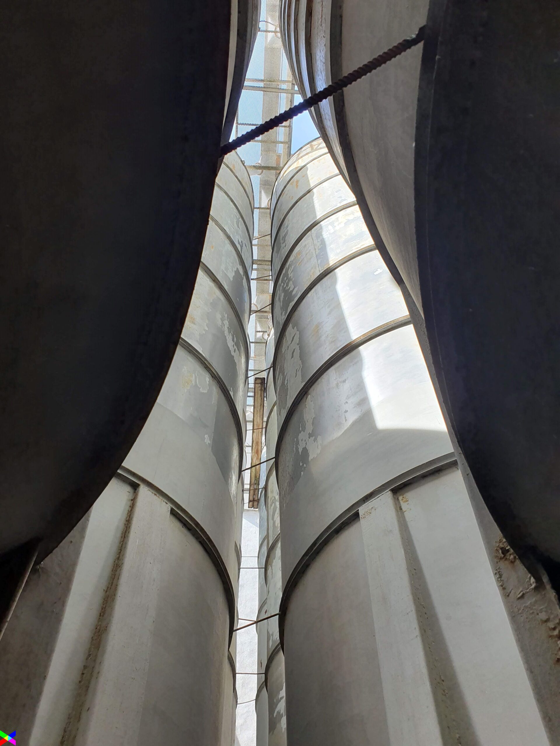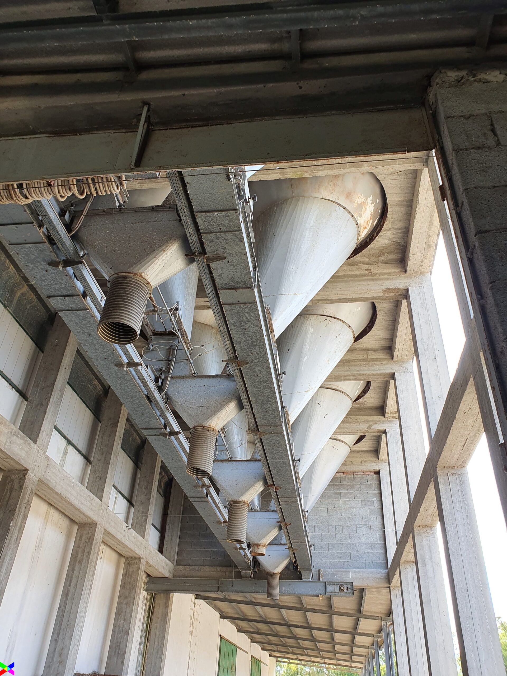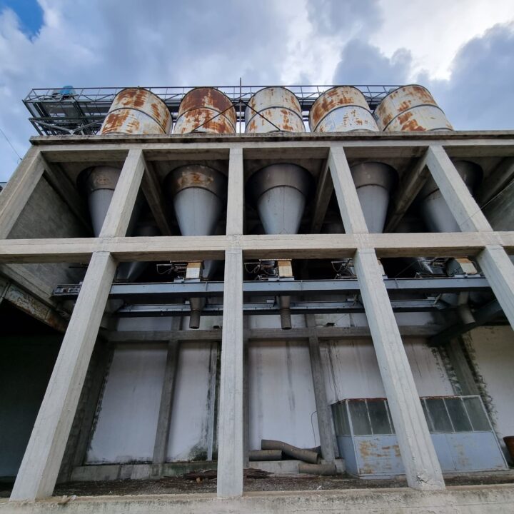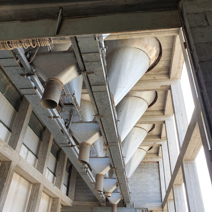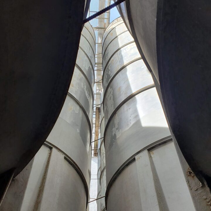 The raw materials from the silos pass through belts in the upper part of the vertical reinforced concrete structure. Its height is 17 m, the plan is rectangular of 7.50 m x 6.50.