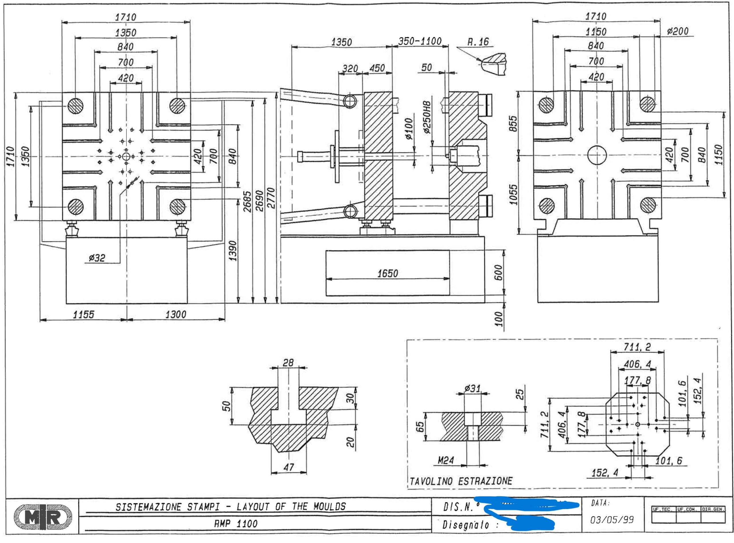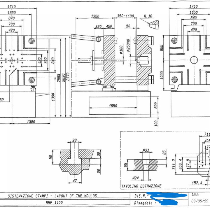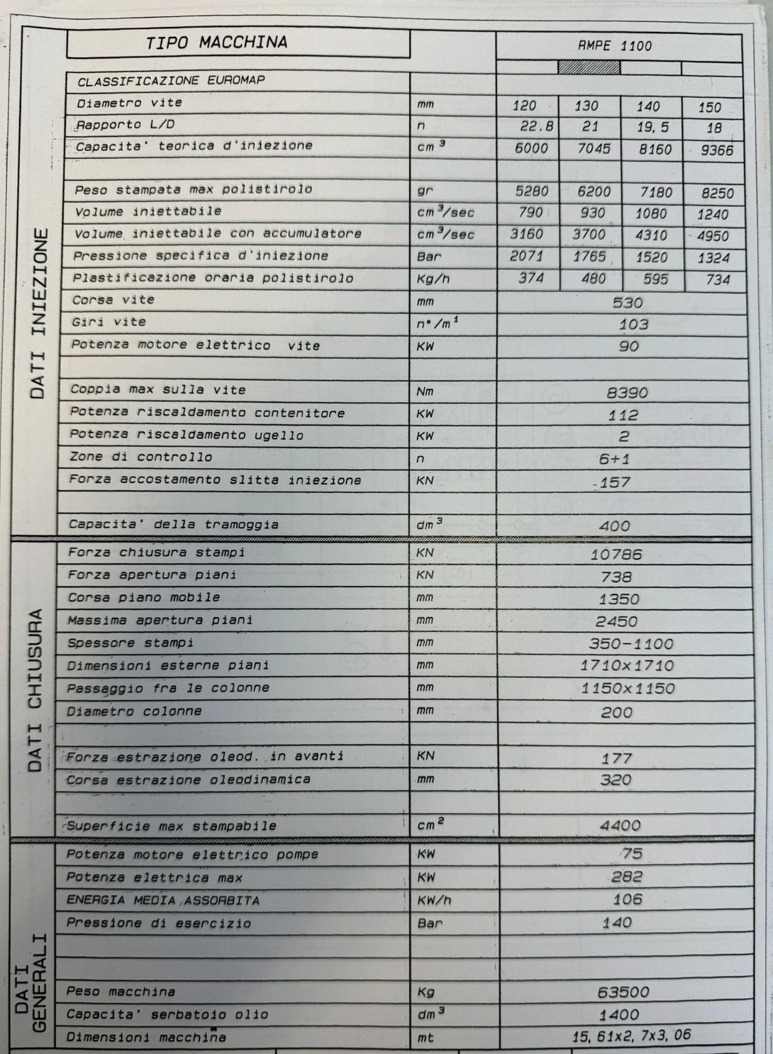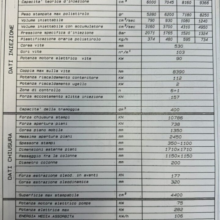 Pressa iniezione MIR 1100 tonnellate anno 2000, 1100 Ton, capacità 7500cm3, diametro vite 130mm passaggio colonne 1150×1150 90kw. La macchina è completa di Robot Engel che verrà ceduto congiuntamente, e si includono i soppalchi: La pressa è al momento allacciata e funzionante, e si dismette per l’acquisto della nuova entro fine gennaio 2025 lo slacciamento.